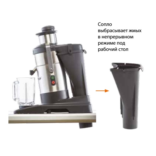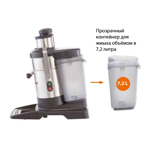 J 100 постачається з жолобом для безперервної подачі макухи прямо у відро для сміття для безперервного приготування соку, напівпрозорим контейнер для м'якоті 7,2-л., похилим піддоном, 2 носиками з функцією антирозбризкування, міцним диском-теркою.