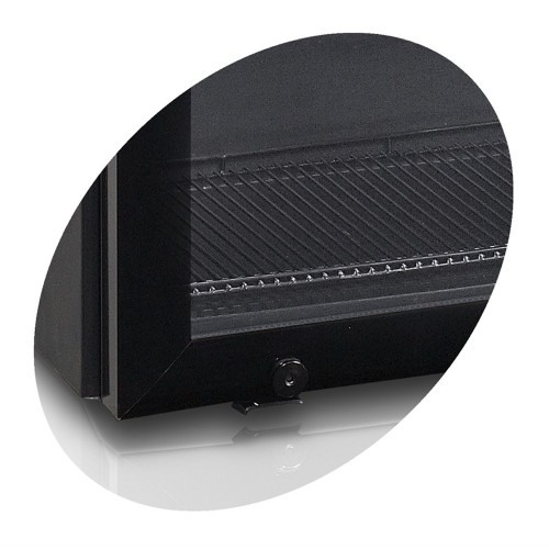 Холодильник виготовлений з пофарбованого металу чорного кольору, механічний пульт управління, внутрішнє оздоблення алюміній з покриттям чорного кольору, 2 решітчасті чорні полички (275x205мм, 275x135мм), замок.