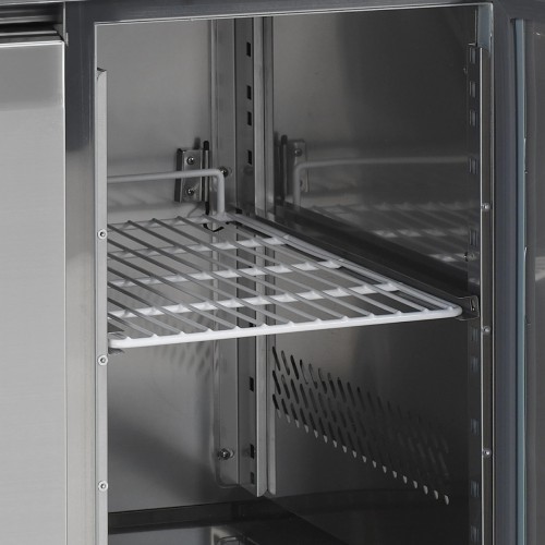 Модель оснащена двома одностулковими дверима, що самі зачиняються, запобігаючи втратам холодного повітря та покращуючи енергоефективність. У комплекті — 2 білі решітчасті полиці формату GN 1/1, що забезпечують зручну організацію внутрішнього простору.