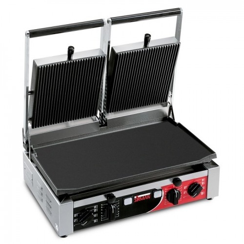 Довговічні плити, виготовлені з обробленого чавуну, для забезпечення гігієни та стійкості до впливу кислот і солей, а також стійкості до окислення. Гриль з 2 верхніми рифленими і нижніми гладкими плитами.