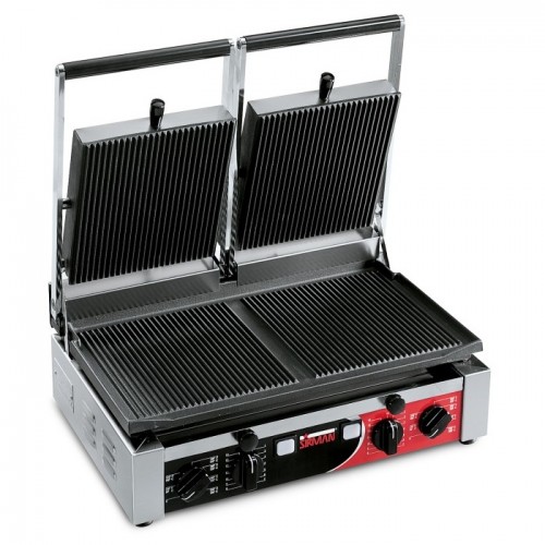 - 2 регульовані термостата до 300 ° C., які дозволяють використовувати окремо дві половини гриля