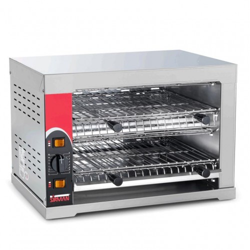 - Ідеальне рішення для підігріву піци, бутербродів і напівфабрикатів; для приготування грінок, гамбургерів, сосисок, тостів з начинкою та коржів, а також креветок, сардин, овочів та інших продуктів, що потребують швидкого або сильного гриля.