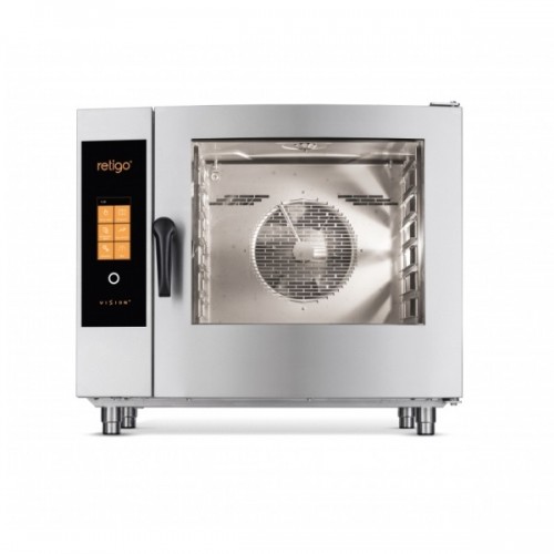 Це один з найпопулярніших конвектоматів Retigo Vision. Типорозмір 611 ідеально підходить для виробничих потужностей від 51 до 150 порцій на день. Розміри контейнерів GN 1/1 (530x325 мм). До типорозміру 611 можна додатково закупити широкий асортимент приладдя – різні види підставок з нержавіючої сталі, витяжний зонт Vision Vent і т. д. Модель 611 можна встановити в комплекті з іншим конвектоматом або регенератором (тепловою шафою). Система пароутворення працює за допомогою бойлера. Джерело тепла електричний.